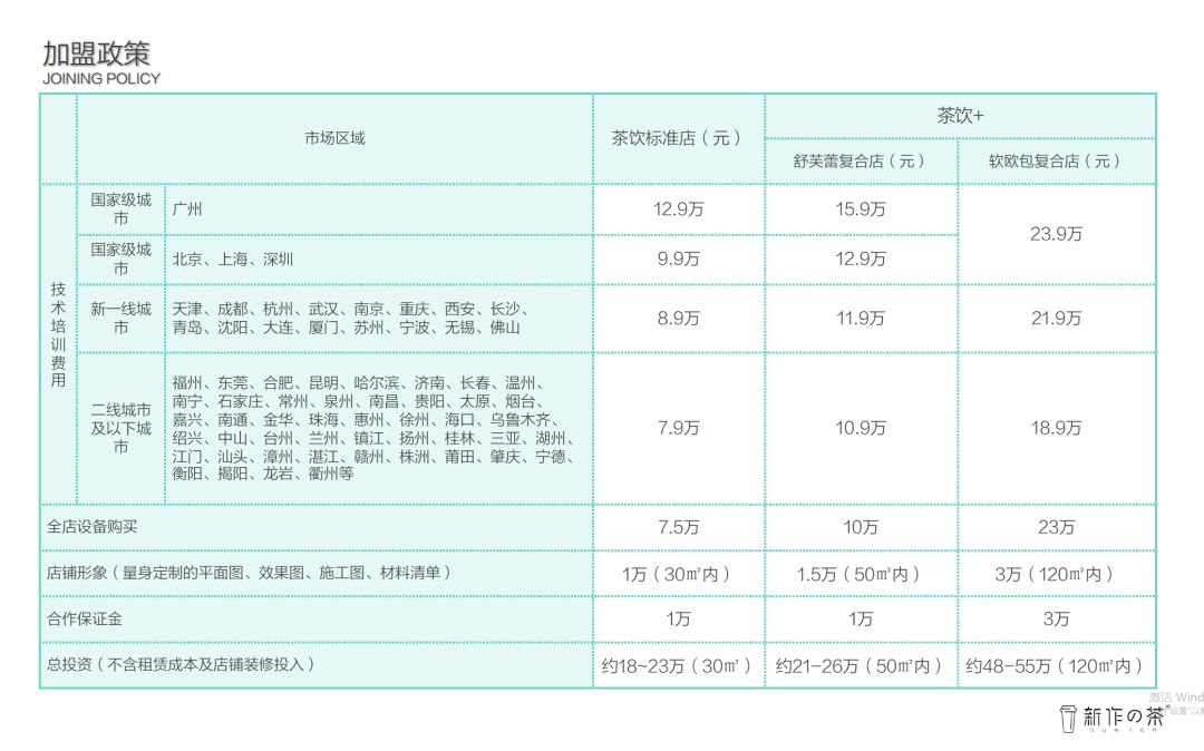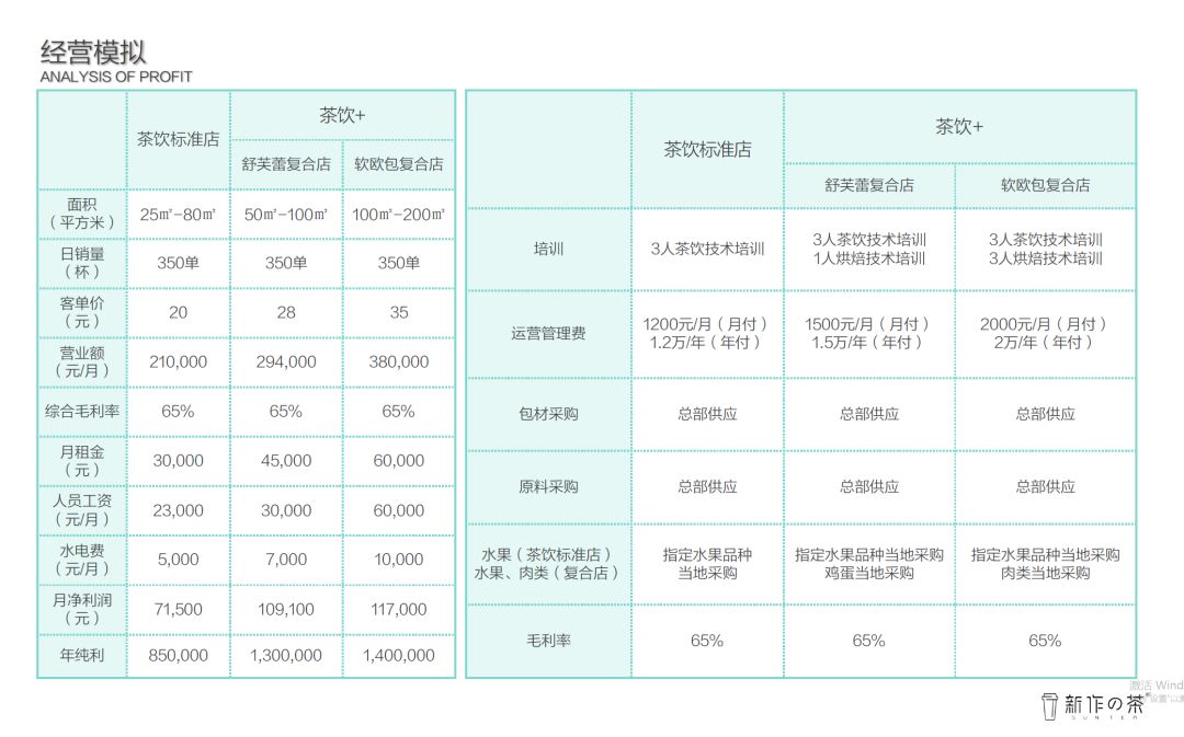上图为新作の茶加盟政策和经营模拟分析,从上图可以清楚获悉品牌对于各个店型的商务政策以及对应店型的投资回报预估,投资者只需逐项核实,确认是否还可能有产生额外费用支出项目,便可大致获悉该品牌的投资回报能力。需要特别提醒的是:人工成本相对固定;原料采购价格市场非常透明,可以比较;店铺租金是日常支出项中最需要重视的一个环节。