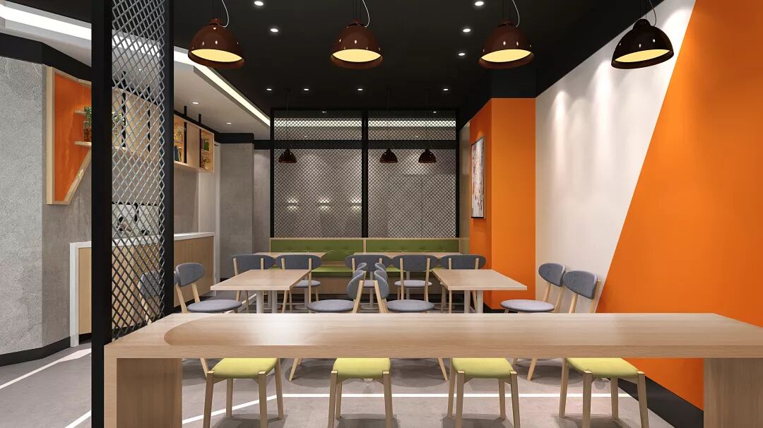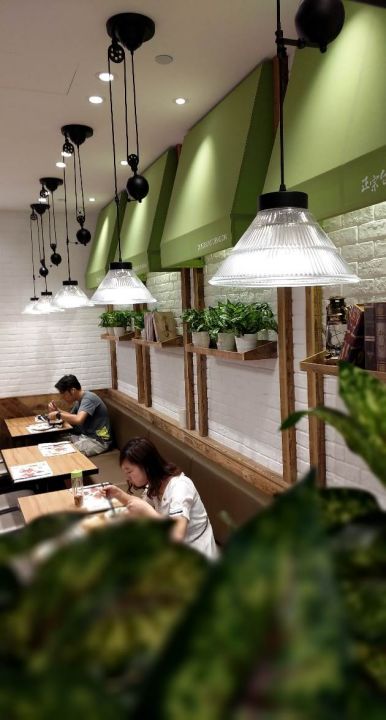 品牌以明亮暖色调结合原木色与绿色的植物,让人体会轻松休闲的同时更好的享受美食。