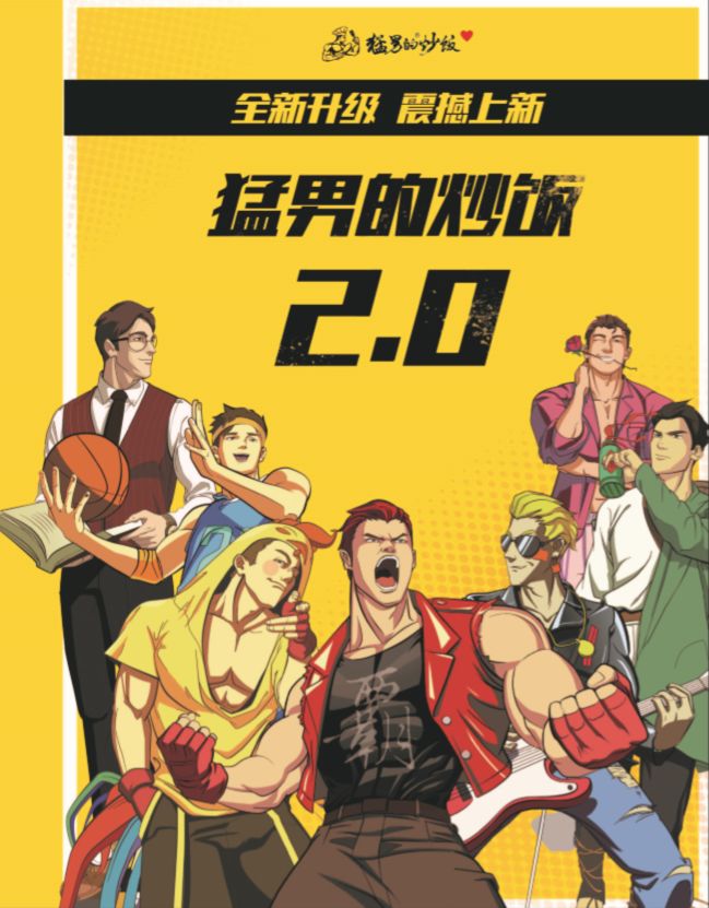 目前「猛男的炒饭」产品SKU共有14款,口味包含江浙的甜、广东的鲜、四川的麻辣等等,推出炒饭界的鲜香麻辣四种味型。2018年6月,团队进行了品牌的2.0升级,把七款新品炒饭拟人化,设计了七个猛男形象。人物形象的设计围绕产品口味展开,包括产品名、色彩、调性等,并配以不同的故事和文案,结合外卖包装、营销活动,在消费者端不断强化“猛男”品牌IP。
