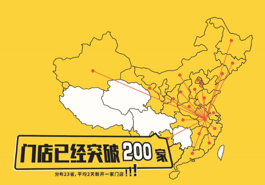 经过两年的直营发展后,2017年「猛男的炒饭」开放加盟,目前在全国开业了200多家门店,覆盖23个省。门店结合了堂食+外卖的模式,单店日销量最高可达500单以上,盈收可观。