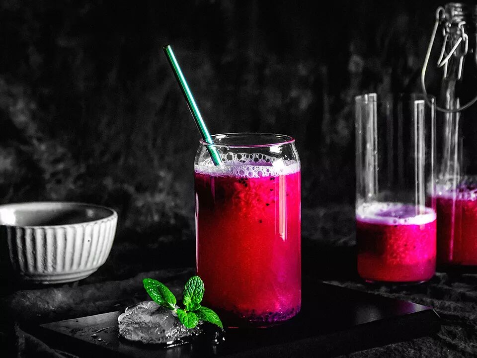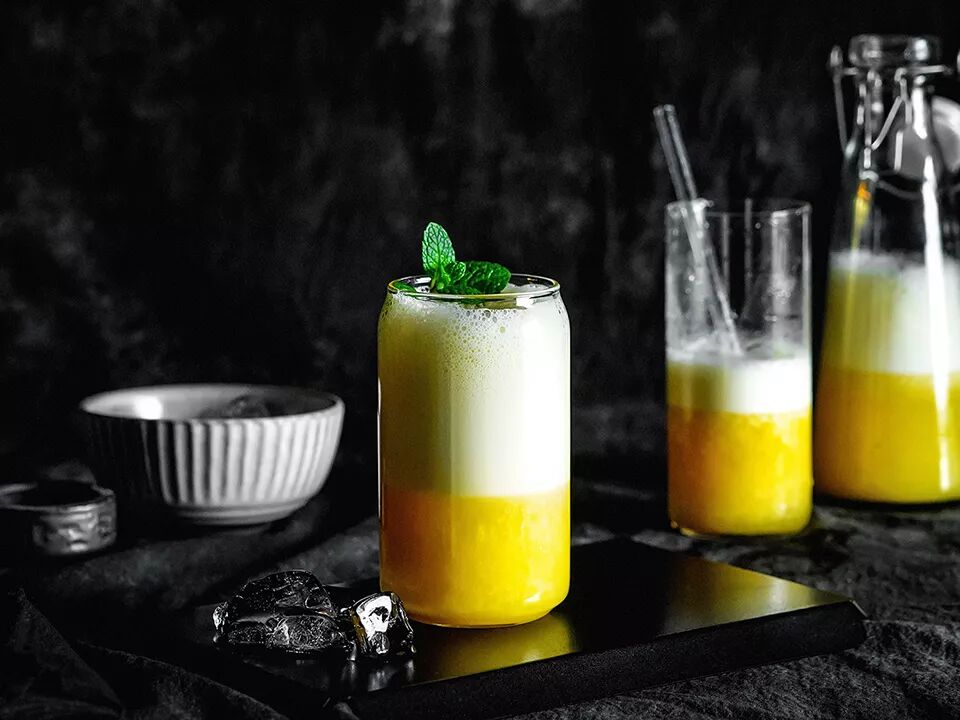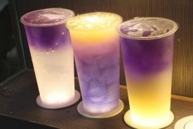 利用蝶豆兰汁的特性及加鲜奶调色,制成不含色素却缤纷的成品,和采用不同鲜果打成果汁、果昔、冰沙,制成渐层效果,使得饮品吸睛度爆表。