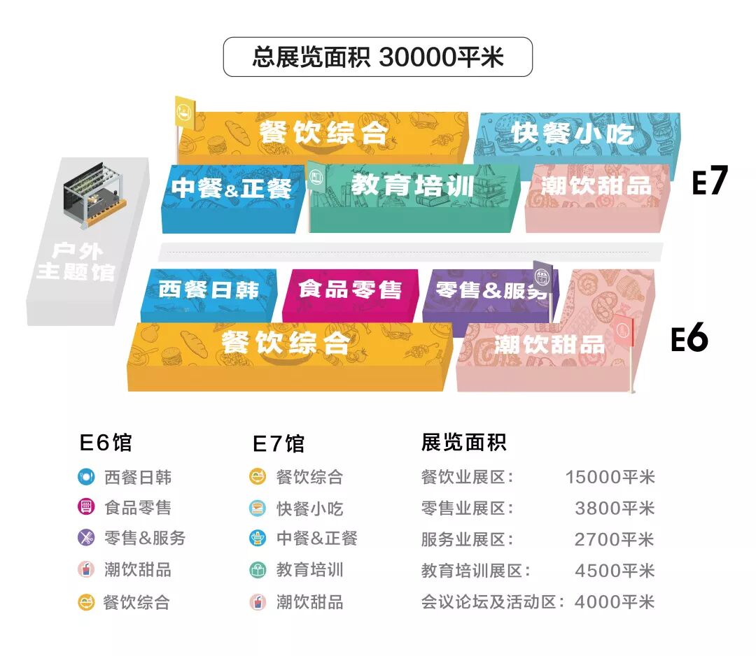 在展会的板块划分和展区规划上,我们也是作出历史性的突破,本届展会我们打造了:餐饮综合、快餐小吃、潮饮&甜品、西餐&日韩料理、中式正餐&大型餐饮、食品零售、新零售&现代服务业、教育培训 以及 连锁资源 9大主题展区。我们预计本届展会独立参展品牌数超过600个,覆盖餐饮、零售、服务、教育以及连锁供应商与服务商,超过80多个主流细分业态。