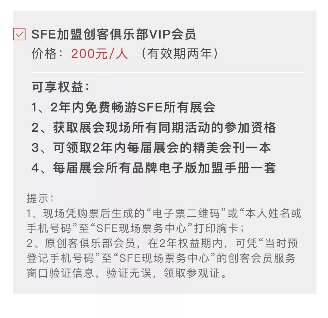 如果您对SFE展会长期关注或者想要获取更多品牌资讯,我们非常诚挚邀请您加入我们的 SFE加盟创客俱乐部,不仅享有两年内免费畅游SFE所有展会的权利,更可获得许多主办方提供的众多福利哦!