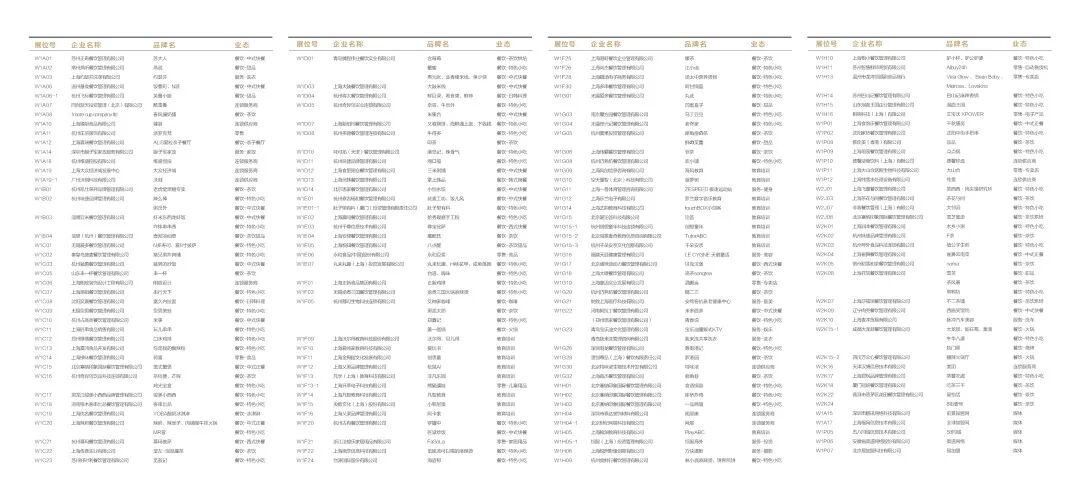 他们包括:联华、Olé、苏宁易购、LAWSON 罗森、优家宝贝、永和大王、家有好面、和府捞面、正新鸡排、满记甜品、大鼓米线、掌上韩品、觅姐麻辣烫、红唇串串香、老佟家、小恒水饺、鼎云轩(上海汤包馆)爱8寸披萨、蛙遇、桂源铺、茶风暴、Heyjuice茶桔便、新作の茶、椰二三、黑泷太郎、YOBA酸奶冰淇淋、雪芙、Momochitl美式爆米花、又卷烧饼、海鲜遇上面、虾米东西龙虾饭、鱼少侠、捧串、型男美蛙、蟹蜜、煮元张、拉丝维斯、留夫鸭、常鸭坊、黑玉饮铺、九鼎轩脆毛肚火锅、壹加回转寿司、脉冲汽车美容、科威国际不动产、沃尔得国际英语、学乐英语、菠萝树、罗兰数字音乐等等。