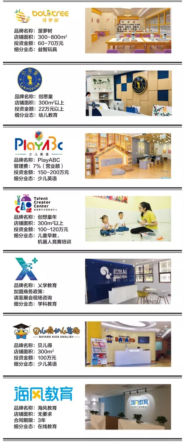 为本届大会的最大亮点,主办方将倾力打造教育产业连锁加盟展区,汇聚了教育行业时下主流业态:K12学科教育、素质教育、早幼教教育、教育科技等。本届邀请到的参展商是拥有科学的教育理念且加盟模式的成熟优秀品牌: