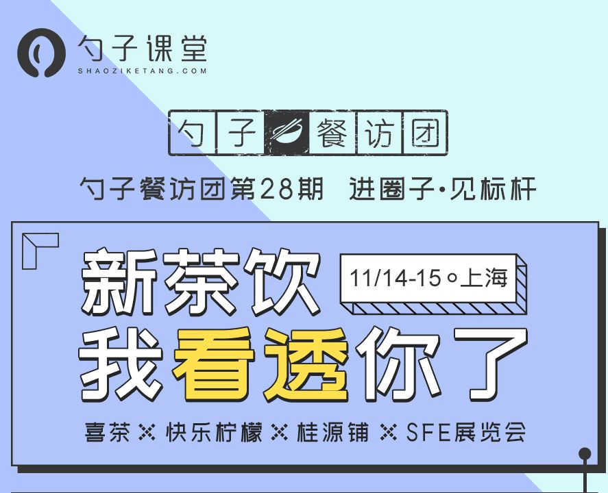 11月14日勺子课堂餐访团将带你深入茶饮市场,与 SFE国际连锁加盟展携手,在14日下午的展会期间提供独家导赏和答疑,让你对饮品市场更加知根知底!