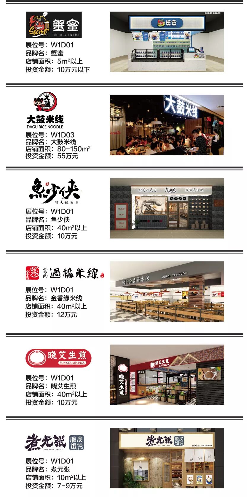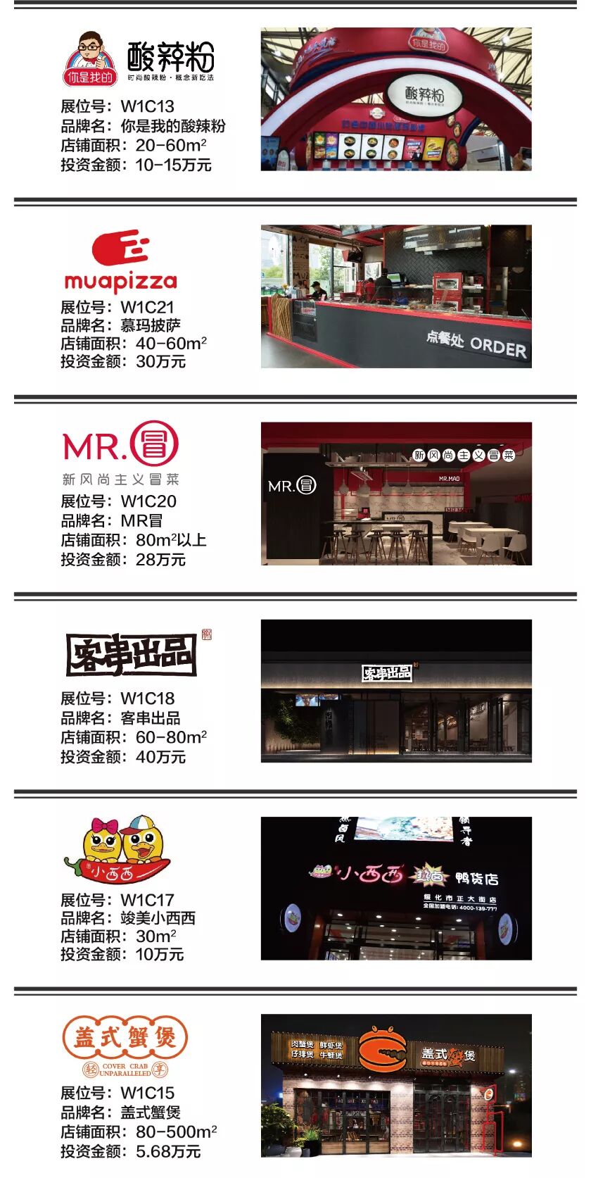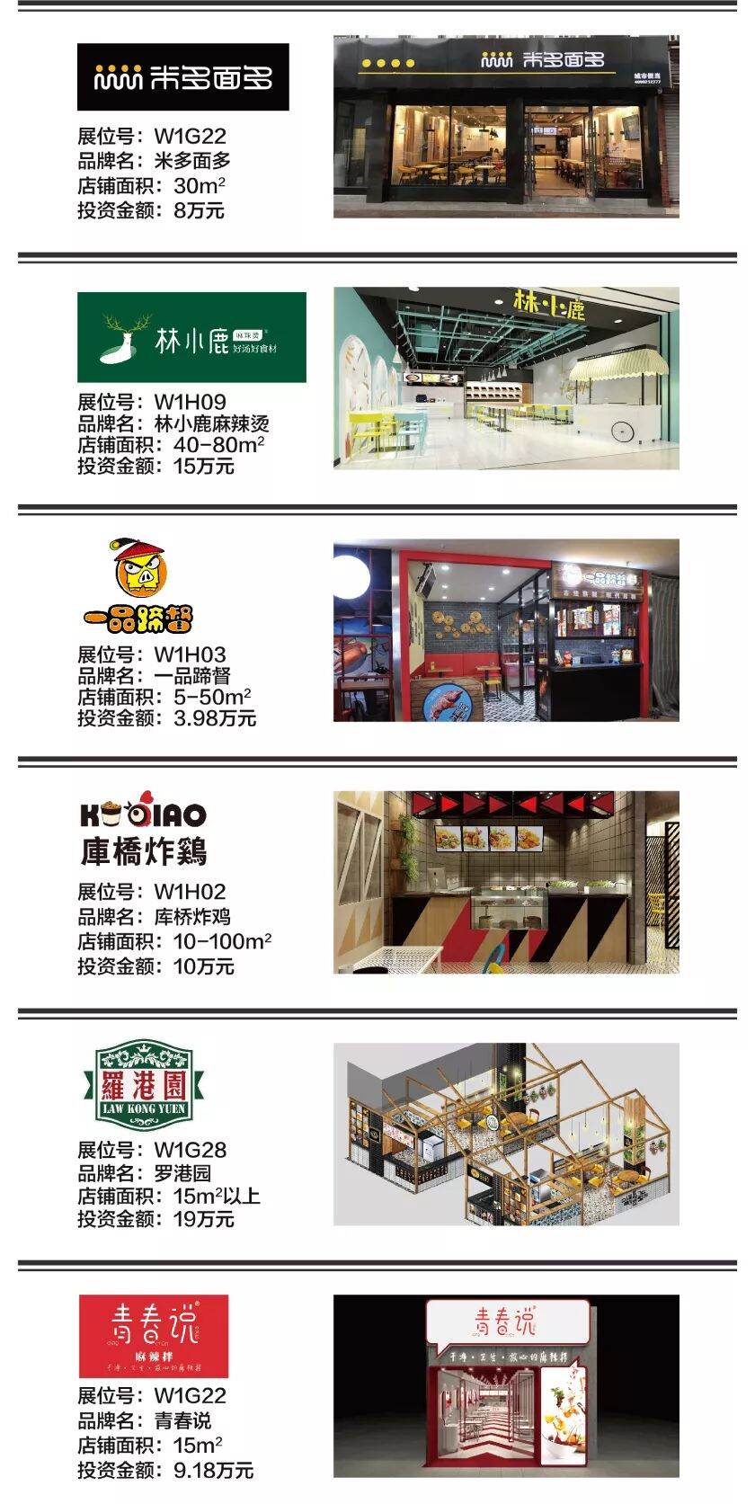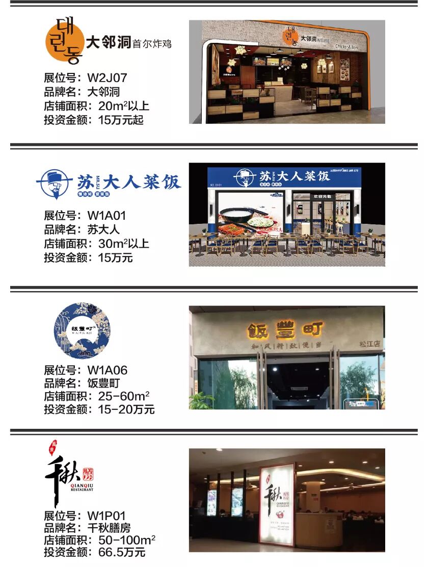 本届展会您将现场一次考察包括 粥、饭、粉、面,四大主食,以及馄饨、饺子、包子、烧卖、小笼包、糕点、烧饼、煎饼、锅盔、肉夹馍、酸辣粉、凉皮、麻辣烫、串串、冒菜、卤味、烤物、炸物、披萨、寿司、汉堡、三明治等等超过40多个快餐小吃细分类别超过100个热门品牌。而其中,米饭类、面食类、炸物类、麻辣类这些热门细分类别,更是有着非常多的品牌可供选择。