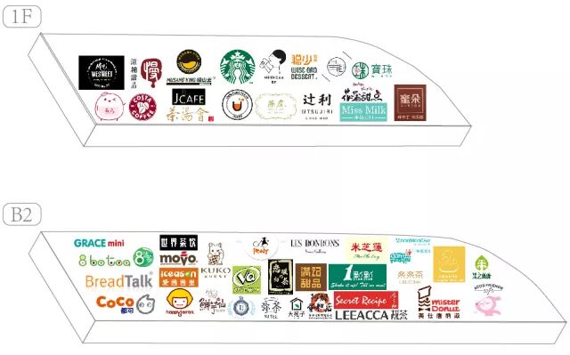 我们做了一些市场调研,这是上海知名的打浦日月光商场和毗邻的田子坊商圈街边商铺的饮品、甜品品牌分布图。据不完全统计,在方圆一公里范围内已经入驻了超过60家各式各样的饮品、甜品店,我们对这些品牌作一个细分业态的分类,其中包含了:新式茶、港式奶茶、鲜榨果汁、创意饮品、咖啡、甜品以及茶饮+X的混合店。