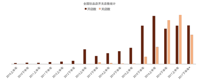 根据2017年中国饮品生态发展报告可见,17年下半年开店数量呈明显增幅,入市活跃度激增,同时关店数也呈明显上升状,2017年茶饮市场经历了开店18万家、关店18万家的洗牌峰值。