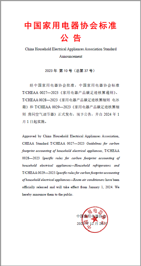 0027—2023《家用电器产品碳足迹核算通则》、T/CHEAA