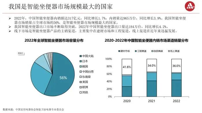 报告中显示,我国也是智能坐便器市场规模最大的国家,2022年中国智能坐便器内销额达317亿元,同比增长1.7%,内销量达965万台,同比增长3.9%,市场销量占全球市场的56%;出口市场不断取得突破,2022年中国智能坐便器出口量达184万台,同比增长4.2%。内销市场中,线下渠道是智能坐便器产品的主销渠道,主要集中在建材市场和工程渠道;线上渠道近年来迅猛发展,新进入的品牌多选择线上渠道作为发力重点。
