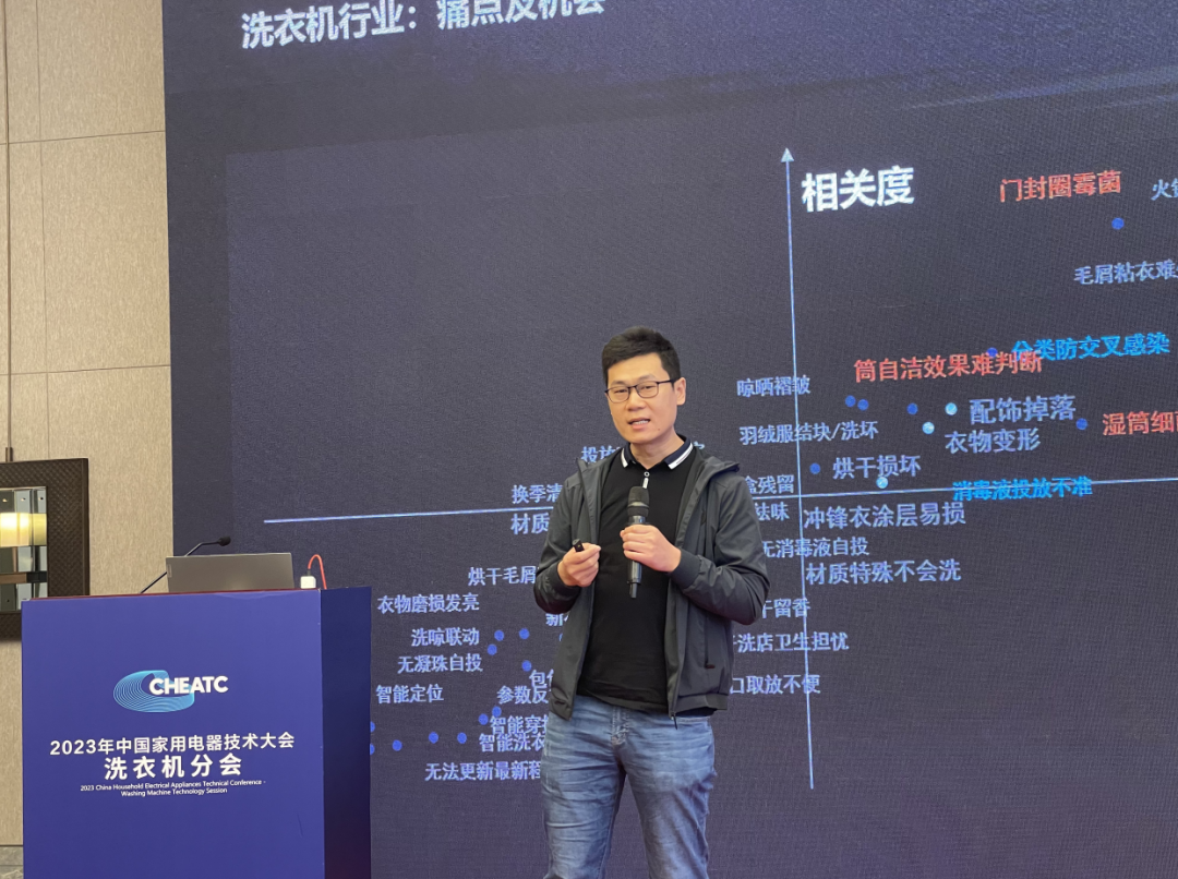 除了对行业趋势性创新技术的探索研究,洗衣机企业也没有忽视对洗净等行业基础技术的深耕。在洗衣机分会上,无锡小天鹅电器有限公司健康洗涤技术负责人杨靑波带来了其最新应用在其洗衣机产品中的蓝氧特渍净技术的详细介绍。“在企业进行技术研发的过程中,混洗串色、白衣发黄、特殊污渍洗不干净,以及洗衣机自身环境的洁净问题,仍然存在用户需求的痛点。