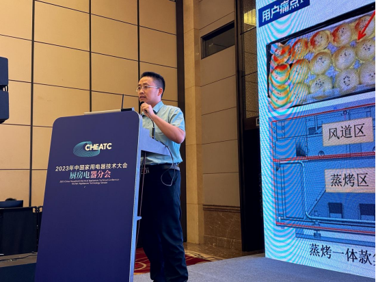 海尔智家厨电集成灶研发总监邓鹏飞分享了集成灶强制对流对烘焙效果的影响研究与应用。他认为,目前集成灶行业面临“内胆腔体左右送风均匀性难以保障”和“部分集成灶蒸烤一体底部无底部加热、底部热量少”的共性难题。由于集成灶结构限制,蒸烤腔体内胆与传统嵌入式结构差异大。经过仿真模拟,烘焙效果不仅受限于温度,还受食物表面热风风速影响,表面风速均匀度较高,预测烘焙品质较好。通过合理调整压筋风机盖板的进风口和出风口,调整内胆结构,提升腔体内部的烘焙效果。
