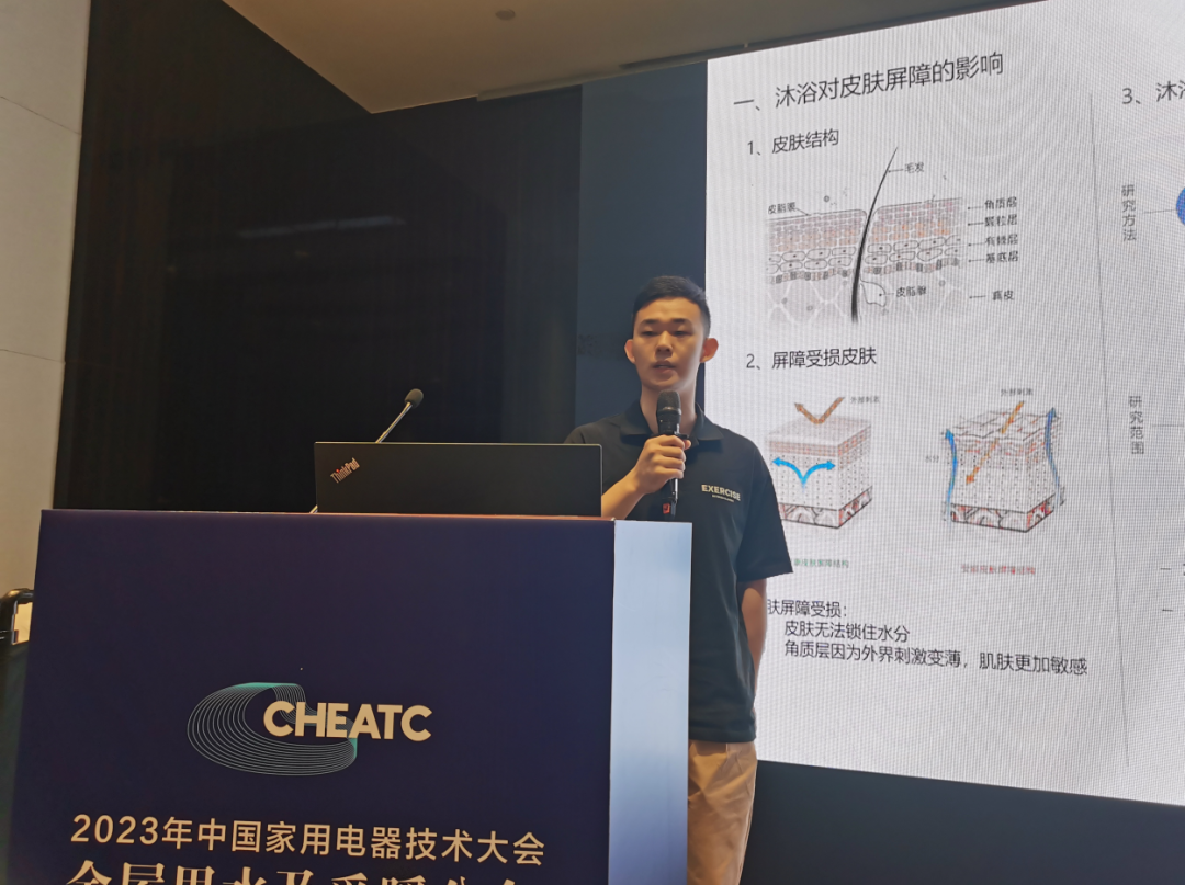 除了饮水的健康,沐浴用水的健康需求也在上升。美的集团中央研究院先行研究工程师陈雨在“健康沐浴护肤技术研究”的演讲中表示,沐浴过程中,皮肤的角质层细胞处于膨胀状态,水分流失增加,皮脂减少,表面pH值升高,同时受洗浴水中余氯刺激,皮肤的屏障很容易打破。解决这些问题,美的从温度控制,减少刺激性物质,增加补水修复成分,增加可感知、可视化功能方面展开全面研究。“我们的研究结果显示,恒温的、可抑菌净化的、加入独家配方的热水器对于皮肤健康有着显著功效。”他补充说。