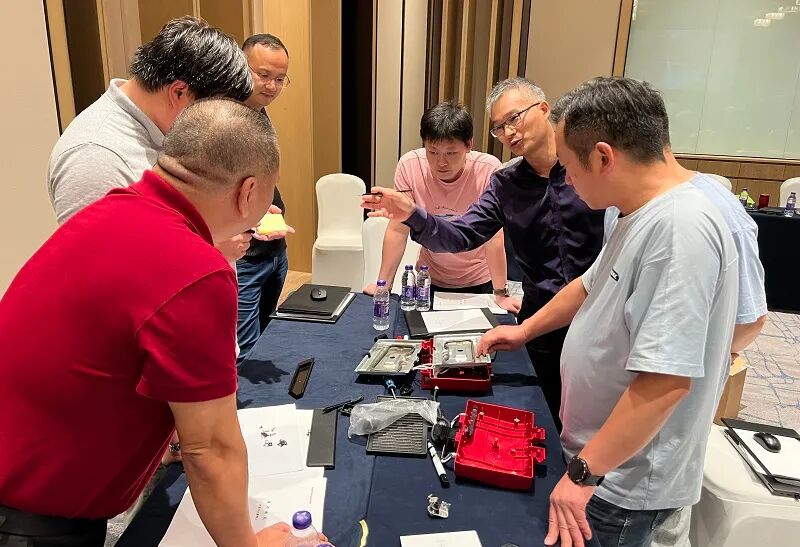 学员企业广东鸿智智能科技股份有限公司提供了一款电饭锅进行对标。经过分析,这款产品的降本几率为10%,但是装配效率的提升空间接近50%。鸿智还提供了煎烤机作为现场拆解练习的样机。学员们亲自动手体验拆装过程,并根据精益设计原则对产品提出了很多改进建议。广东鸿智智能科技股份有限公司总经理陈建波表示,这次学习收获颇多,不仅对产品设计有了全新的认识,更发掘出很多产品改善的创新点。以前企业只是迫于成本压力进行改善,毫无章法可循。DFMA精益设计方法非常实用,为企业开辟了一条新思路。