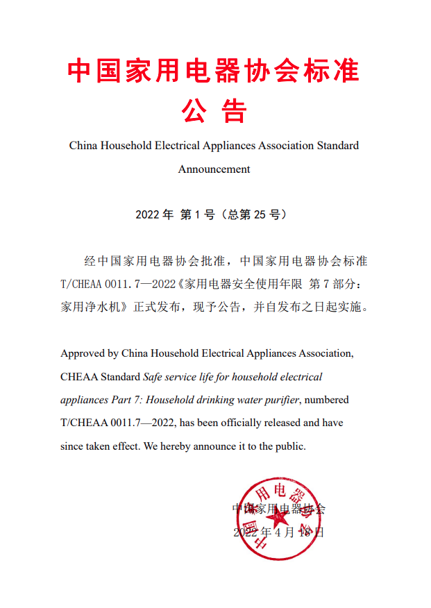 5月31日,由中国家用电器协会指导、中国家电网主办的“双碳我先行 TAN出新生活 畅享健康水 至臻水世界”2022中国家庭全屋用水行业高峰论坛于线上举行。会上,还对中国家用电器协会团体标准T/CHEAA 0011.7-2022《家用电器安全使用年限 第7部分:家用净水机》(下称“净水机安全使用年限标准”)进行了宣贯,以推动净水行业进一步绿色健康发展。