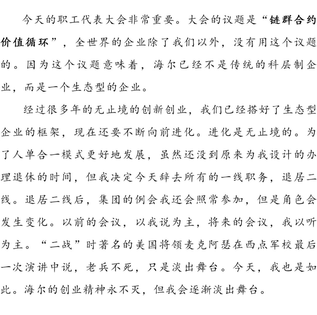 看未来,周云杰带领新的领导班子一定会让海尔生态持续进化。他们从1988年大学毕业就来到了海尔,参与了海尔改革的全过程,所以他们具有改革和创新的基因。我相信他们一定会为海尔的生态进化创造更好的条件、提供更好的环境。(根据张瑞敏在海尔集团公司第八届职工代表大会上的讲话录音整理,未经本人审阅。)