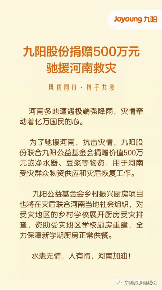 九阳股份联合九阳公益基金会捐赠价值500万元的净水器、豆浆等物资,用于河南受灾群众物资供应和灾后恢复工作。