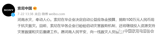 索尼中国官方微博宣布,已启动在华公益应急金预算,向河南捐款100万元人民币用于抗震救灾。