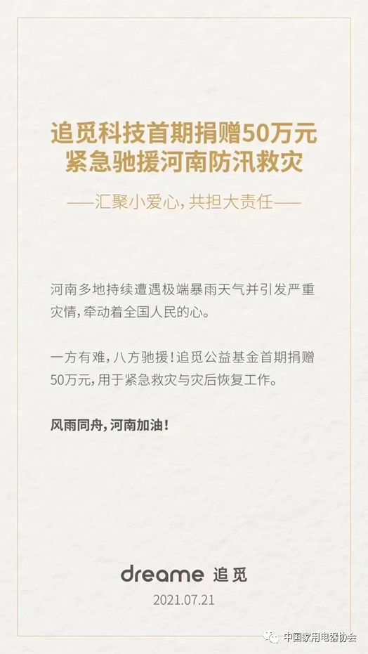 追觅科技捐赠50万元用于紧急救灾与灾后恢复工作。