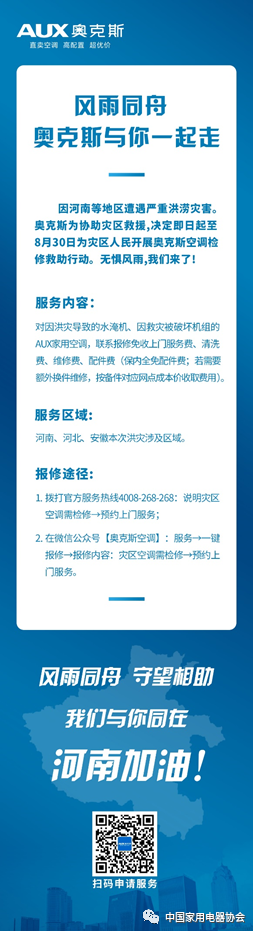 奥克斯空调开通救助通道紧急开展洪灾检修行动,即日起至8月30日为河南、河北、安徽本次洪灾涉及区域开展奥克斯空调检修救助行动。
