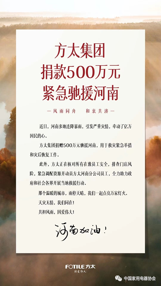 方太集团捐赠500万元驰援河南,用于救灾紧急举措和灾后恢复工作。