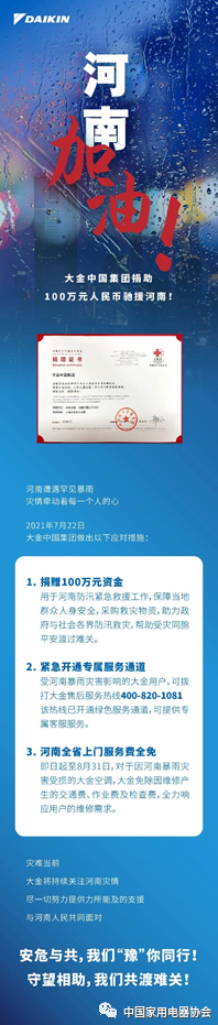 大金中国集团捐助100万元驰援河南,并开通专属服务通道。