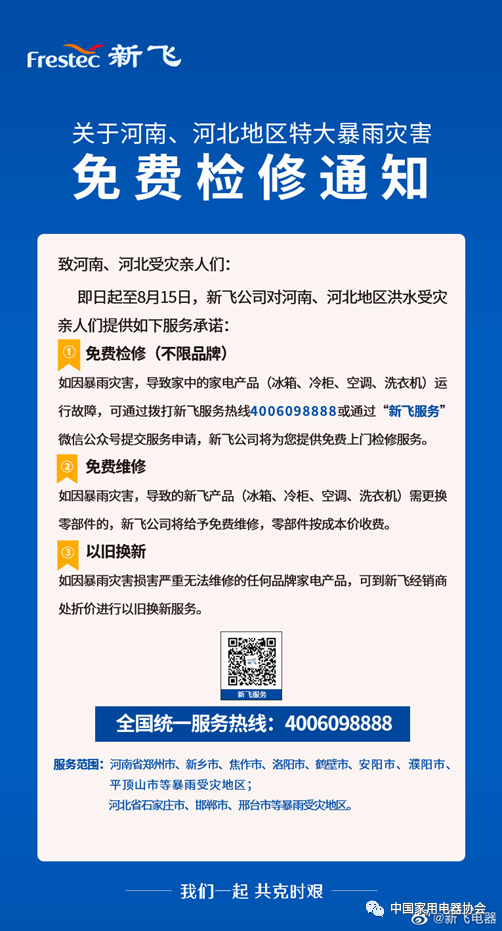 地处受灾严重区域内的新飞电器宣布,7月24日至8月15日,对河南、河北地区家电受损用户提供免费检修、免费维修和以旧换新三大活动,帮助受灾群众解决因洪水而导致家电受损问题。