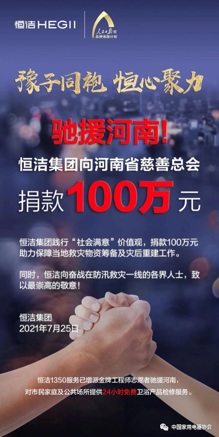 恒洁卫浴集团向河南省慈善总会捐赠100万元,联合前线的救援机构与慈善组织,共同支持抗洪救灾及灾后重建的工作。