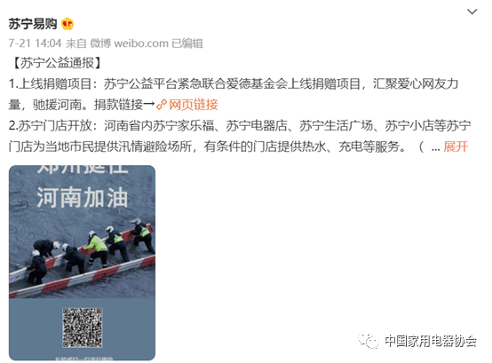 苏宁易购联合爱德基金会捐赠急需物资;苏宁易购物流免费开放郑州苏宁易购物流基地及河南全省10余中转中心,承接各类救援物资的仓储和配送服务;开放河南省内多家门店,为市民提供汛情避险场所,提供热水及充电服务。