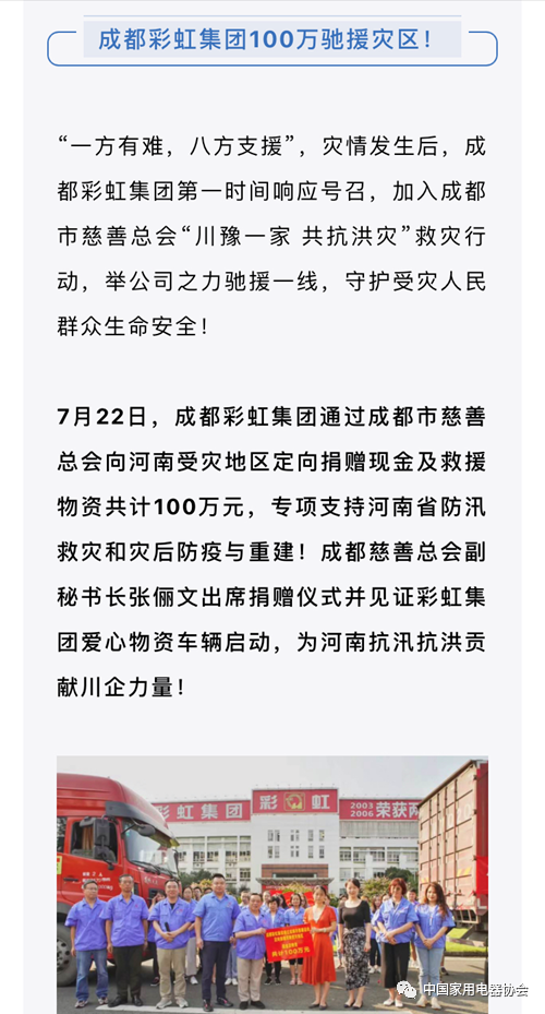 7月17日以来,河南连降特大暴雨,7月20日郑州特大暴雨引发严重汛情,牵动人心。一方有难,八方驰援,中国家用电器协会部分会员及相关企业捐款捐物,并竭尽所能开展救助服务。以下为不完全统计情况: