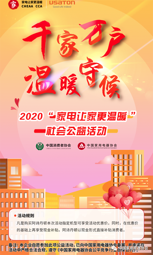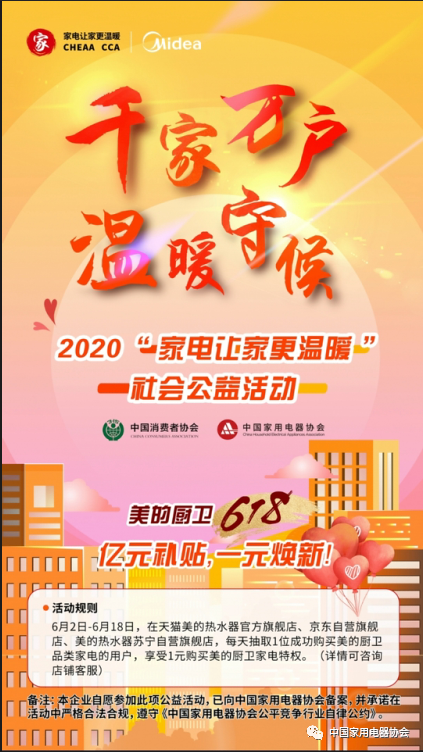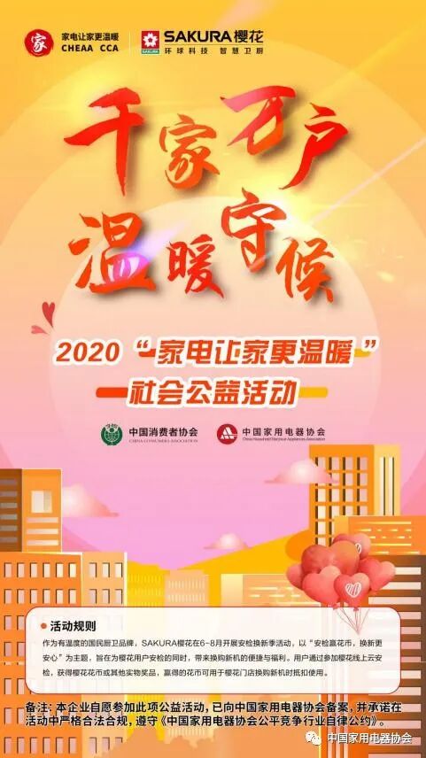 由中国家用电器协会联合中国消费者协会发起的“家电让家更温暖”社会公益活动已于6月16日正式启动,包括美的、阿诗丹顿、三高电器、樱花等多家首批参与的企业积极响应,纷纷推出各类优惠政策,促进市场繁荣。