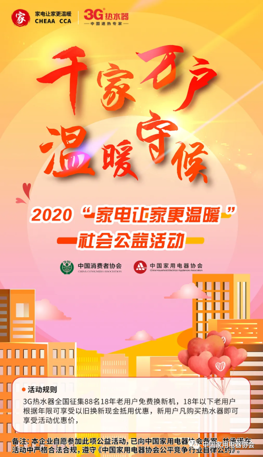 3G热水器快速响应转战线上营销,开展了“千万补贴,疫干二净”等多场福利直播。此次响应“家电让家更温暖”公益活动,3G热水器正积极推进“乔迁之喜-寻找18年老用户免费换新机、以旧换新”等活动,以优质产品活跃市场,拉动消费,让家电使消费者的家更温暖。