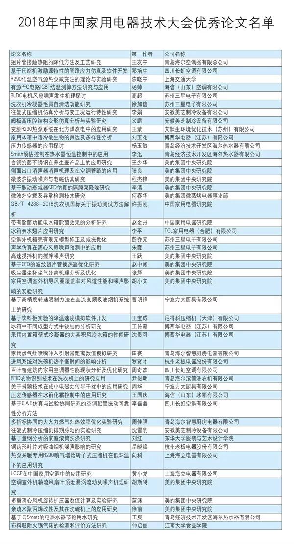 2018年中国家用电器技术大会优秀论文名单揭晓