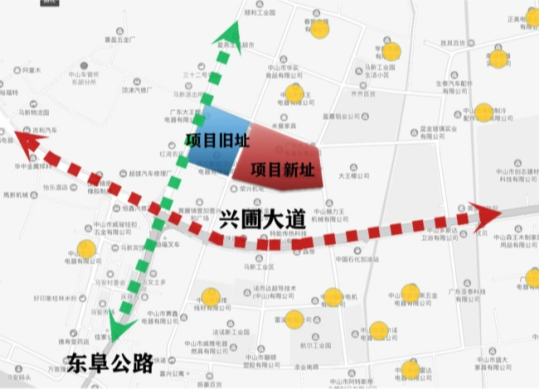 东阜公路(接阜沙、东凤)与兴圃大道(接南头、顺德、三角)交汇处,