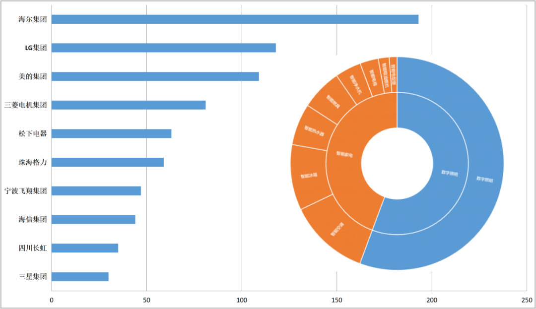 通过分析新增公开或公告专利信息,创新主体可以了解某一个技术领域的最新专利技术,了解技术发展趋势以及竞争对手研发现状,从而提高创新主体在该技术领域的研发创新能力,降低侵权风险,提高创新主体的市场竞争力。通过检索,得到智能家居领域于2023年7月1日至2023年7月28日期间新增公开或公告专利申请4575件,其中数字照明领域2747件,智能家电领域2188件(部分专利同时属于多个技术领域),新增公开或公告专利的细分领域及主要申请人情况如图4所示。