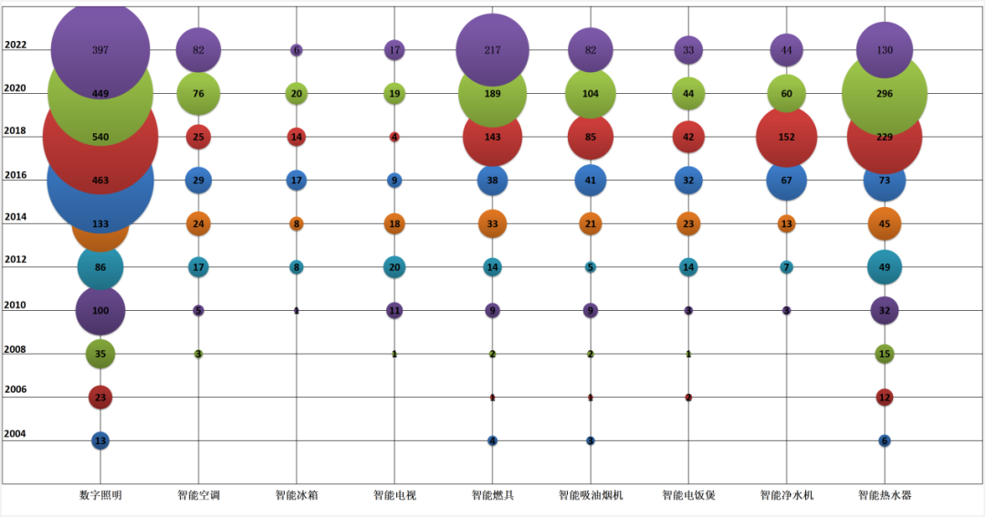 图3展示了中山市智能家居各个细分技术领域的发展情况。纵坐标表示专利申请年份,横坐标表示各细分技术领域,图中的气泡越大代表该项技术下的专利申请数量越多。从图中可以观察到,在2010年之前,中山市在智能家居技术各个细分领域的专利申请数量相对较少。然而,2010年之后,中山市智能家居各细分领域专利申请数量普遍呈现增加趋势,同时,专利申请主要集中在数字照明、智能燃具和智能热水器等细分技术领域;智能净水机、智能吸油烟机、智能空调、智能电饭煲领域的专利申请增速次之;智能冰箱和智能电视的专利申请增速和总量均还有待加强。在数字照明技术领域,欧普照明电器(中山)有限公司和广东光阳电器有限公司是主要的创新主体;在智能燃具技术领域,华帝股份有限公司和TCL家用电器(中山)有限公司是主要的创新主体;在智能热水器技术领域,中山百得厨卫有限公司和中山市恒乐电器有限公司是主要的创新主体。