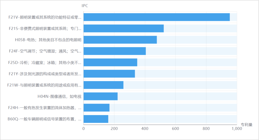 如图5所示,智能家居领域于2023年7月1日至2023年7月28日期间新增公开或公告专利的IPC分类号主要集中在F21V(照明装置或其系统的功能特征或零部件),其次是F21S(非便携式照明装置或其系统)、H05B(电热;其他类目不包含的电照明)。
