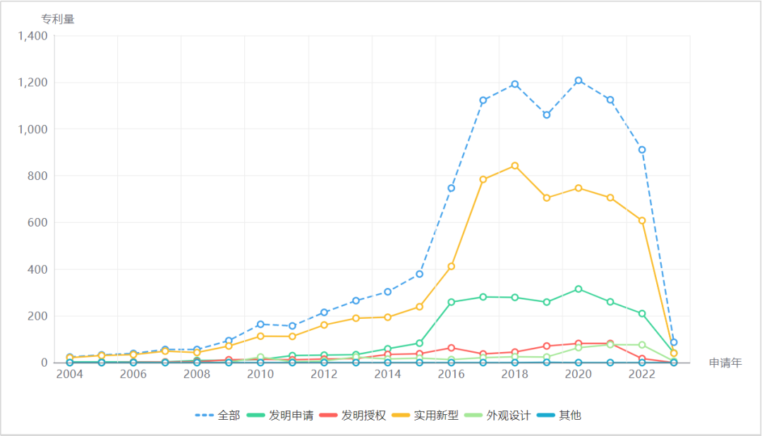 根据图2所示,中山市智能家居专利申请呈现出四个不同阶段的发展趋势。首先是2004年至2008年的萌芽和缓慢发展期,专利申请数量从2004年的20多件增长到2008年的56件。接着是2009年至2014年的稳定增长期,然后是2015年至2018年的快速增长期。目前产业已进入2019年以后的调整阶段,虽然2019年的各项数据指标有所下降,但总体上2019年及以后的专利年申请量仍保持在1000件以上。这一趋势表明,中山市智能家居领域的技术近10年来发展迅速,相关的专利技术呈现出蓬勃发展的前景。这与近年来5G、人工智能等新技术与制造业的加速融合、全球消费升级以及中山市对智能家居产业的重视和加速培育有关。