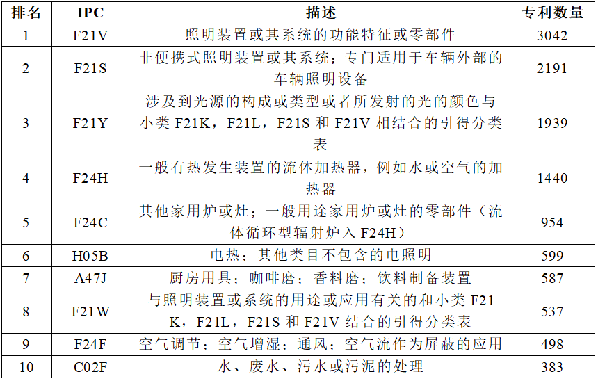 表2统计了中山市智能家居领域专利申请的IPC分类号及其对应的专利申请数量,可用于研究中山市智能家居专利申请在重点技术领域的分布、重点技术领域的专利申请活跃程度,从而明晰技术的发展趋势和热点等。