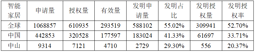 根据表1数据显示,全球智能家居专利申请量为1068857件、有效量为293519件,中国专利申请量为442853件、有效量为177597件,中山市专利申请量为9314件、有效量为4710件,说明智能家居产业在中国的专利申请数量和现存有效专利量在全球范围内均占有重要地位,为全球创新发展做出了积极贡献。然而,就专利申请类型而言,在智能家居领域全球的发明专利申请数量为588102件,占比约为55.02%;中国的发明专利申请数量为183024件,占比约为41.33%;中山市的发明专利申请数量为2729件,占比仅为约29.30%。可见,中国在智能家居领域的发明占比明显低于全球水平,中山市的发明占比更低。同时,在发明专利授权率方面,中国和中山市的比率也相对较低,仅分别为33.71%和20.37%,都低于全球平均水平(52.70%)。由于实用新型专利和外观设计专利经过初步形式审查即可获得授权,而发明专利授权之前需经过实质审查,发明专利权的稳定性和价值度会相对高于实用新型专利和外观设计专利。发明专利要想获得授权,需要同时满足新颖性、创造性和实用性的要求,我国及中山市智能家居领域发明专利授权率相对较低,意味着国内以及中山市相关创新主体在研发投入及知识产权布局上还存在一定欠缺。