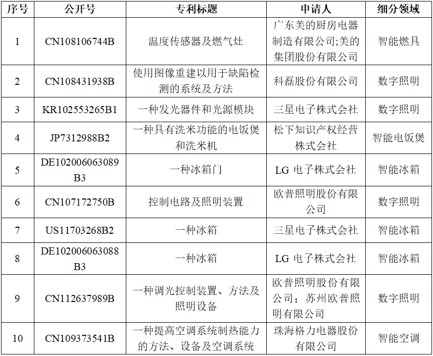 智能家居领域在2023年7月1日至2023年7月28日新增的4575件专利中,专利价值度为60以上的专利数量为71件,分布在数字照明领域44件,智能家电领域27件。在本部分中,列举出本领域新增专利中前10个最具价值的专利。详细信息如下表4所示。
