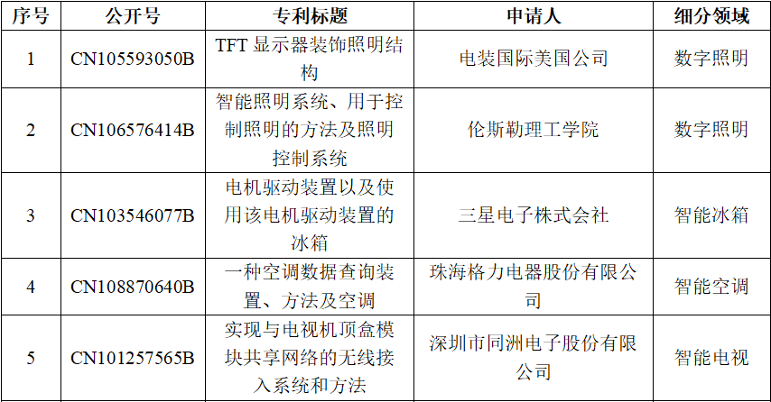 通过检索并筛选出智能家居领域在2023年7月1日-2023年7月28日新增公知公用专利共有2654件。列举其中的部分新增公知公用专利详情,如下表5。