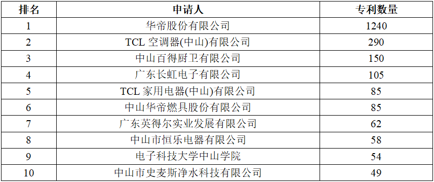 表3 中山市智能家居产业主要专利申请人排名Top10(数量:件 数据来源:壹专利)