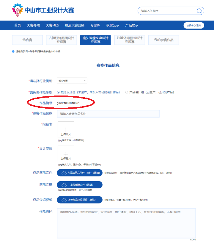 作品编号:选择“行业类别和作品类型”后,系统自动生成“作品编号”,用于”南头智能家电设计专项赛报名表“及”参赛版头“。