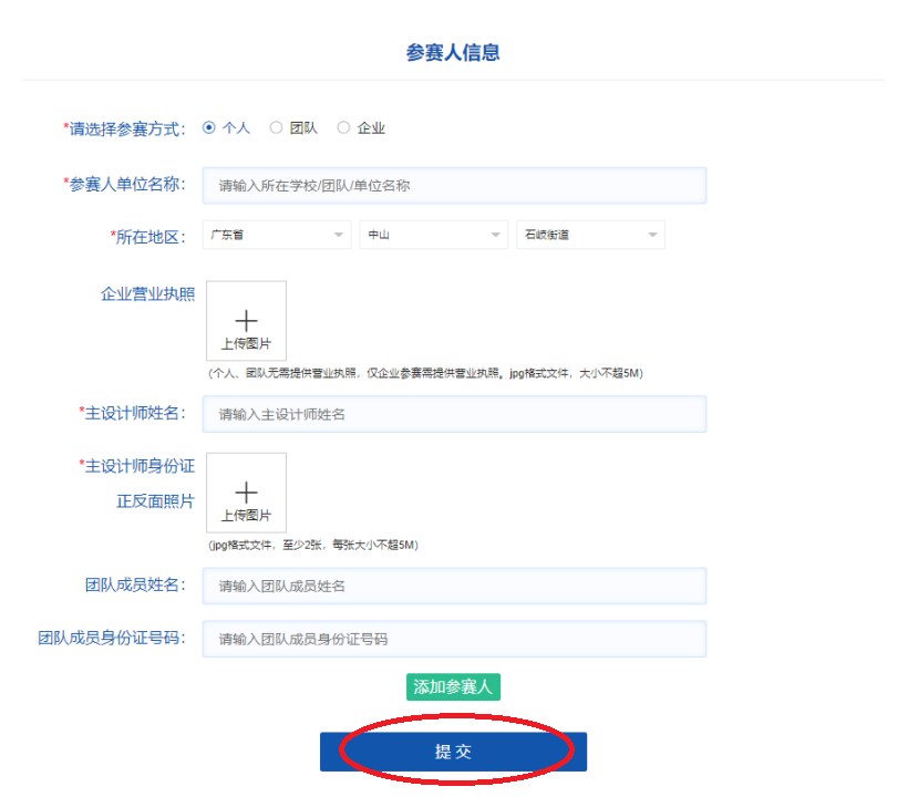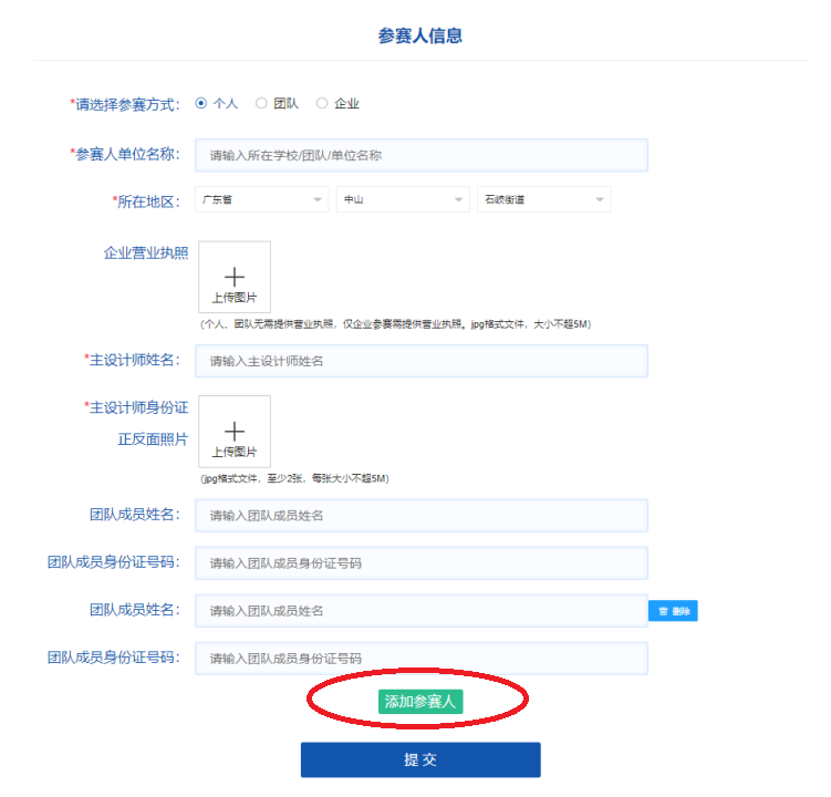 参赛人信息:团队参赛可点击“添加参赛人”,参赛人数不超过5人。