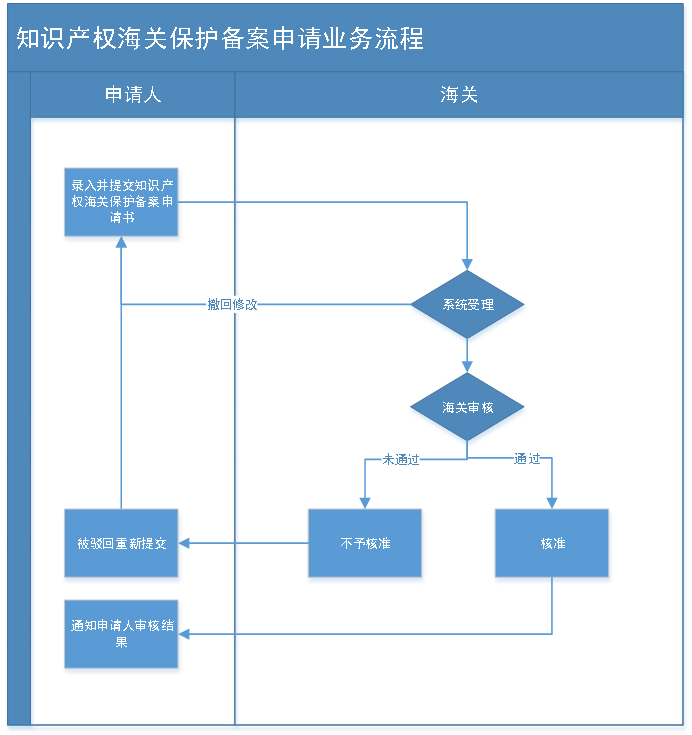 申请人登录知识产权海关保护系统→在线填写备案申请表→提交备案申请→系统受理→材料补正(申请人发现申请错误需要补正的,可以在海关审核前自行撤回修改)→海关审核→办结。