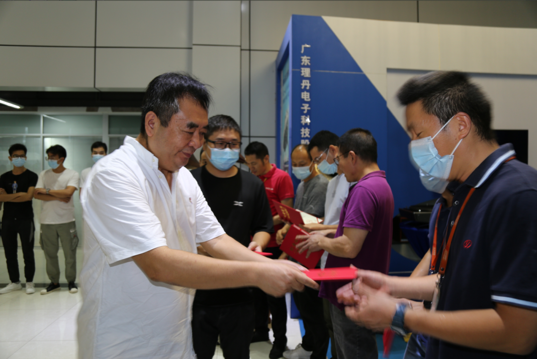 广东理丹电子科技有限公司总经理刘志雄为第一期高级IE研修班考试合格的学员代表颁发结业证书