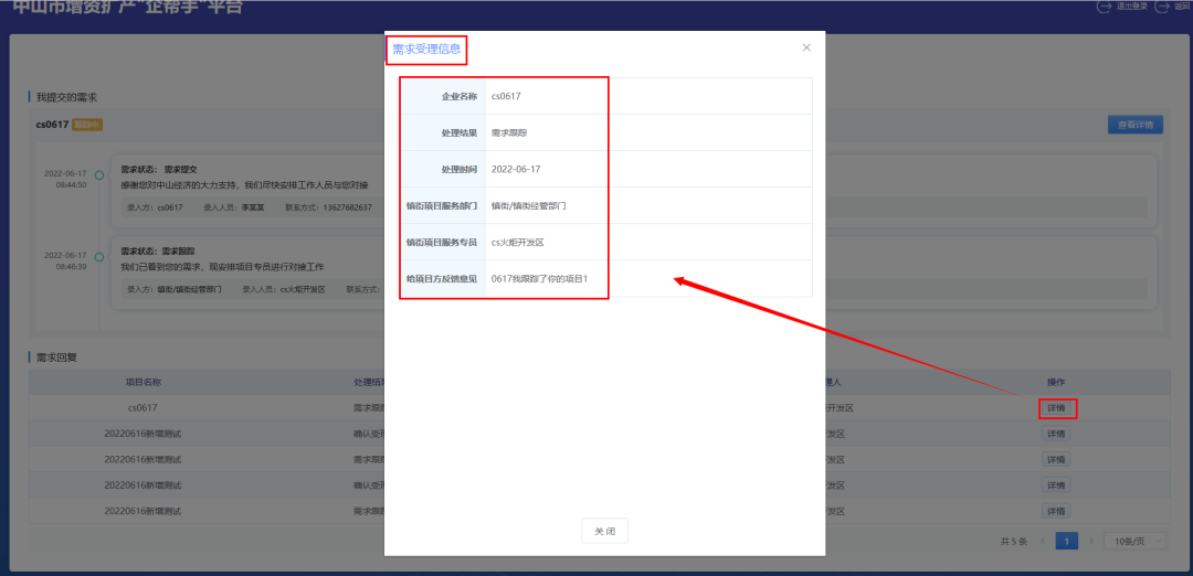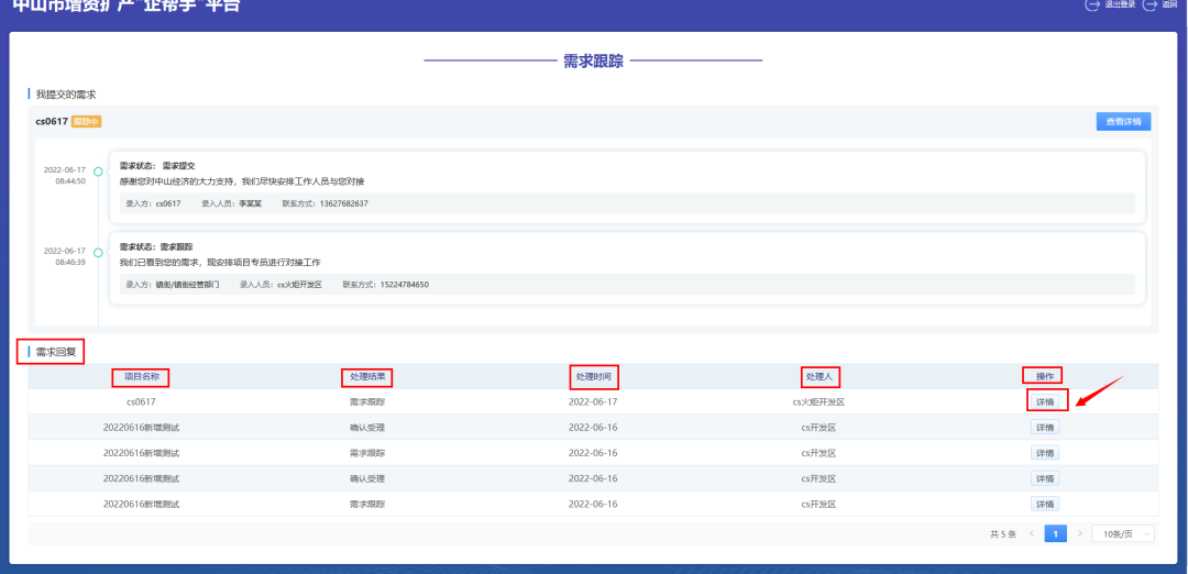 (3)在“需求回复”中,显示着项目的项目名称、处理结果、处理时间、处理人还有一个详情的操作。点击右下角的详情按钮,可以看到需求受理信息,其中包括关于该项目的反馈意见。