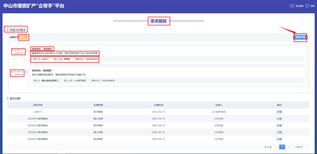 (2)在“我提交的需求”中,左上角的项目名称旁附有该项目的进展状态,分别有“待处理”、“跟踪中”和“已受理”这几种状态。在中间部分显示需求的不同状态信息以及时间节点,在每个状态下面记录着项目的录入方、录入人员和联系方式,还有一个回复提醒。点击右上角的查看详情,可以查看项目的填报详情。